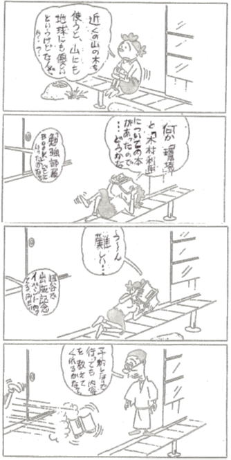 サザエさん一家に勉強部屋のPRを手伝っていただきました!!! <1>サザエさん「近くの山の木を使うと、山にも地球にも優しい」というけどなんで???」 <2>サザエさん「なにか「環境」と「木材利用」についての本があったので・・・どうかな?」 マスオさん「「勉強部屋Book」どこにいったかな」(マスオさん購入ありがとうございます・・・) <3>サザエさんん「うーん、難しい・・・」(ごめんなさい) マスオさん「四谷で出版記念イベントやっているみたい」(ありがとうございます・・・) <4>マスオさん「予約しないでいっても内容教えてくれるかな?」(はい、サザエさんなら) (ごめんなさい当日お逢いできなかったので、どこか別の会場に間違っていかれたかもしれませんね。解らないことがあたら、電話でなんでもきいてくださいね?とサザエさんに伝えてくださいネ) ーーー 以上です 来年は応募して、長官賞をもらえるように頑張ろうかな?でも今年の長官賞は2作品とも10代なんだそうです) ーーーーー konosaito5-12<benkyobeyabooksazaesam> |
