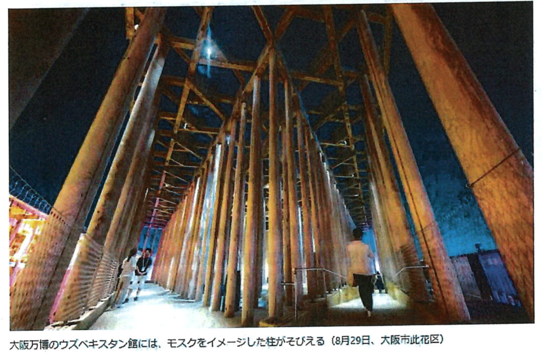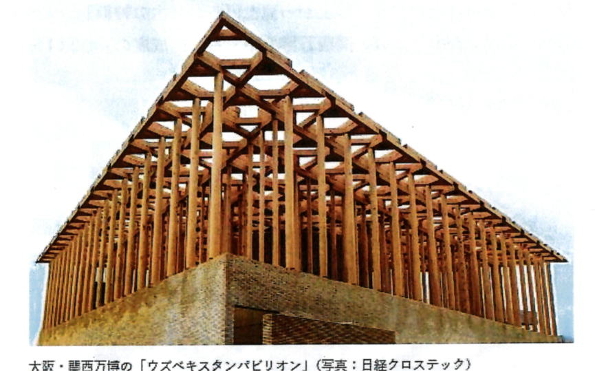 木材は・・・「日本の9カ所から集めたスギの木を使った柱には、それぞれ近距離無線通信(NFC)タグがついている。NFC機能付きのスマホをかざせば、柱がどこの木なのか説明を見ることができる。柱は万博後にウズベキスタンヘ逼び、日本の樹木について教える教育の場などで活用するという。」