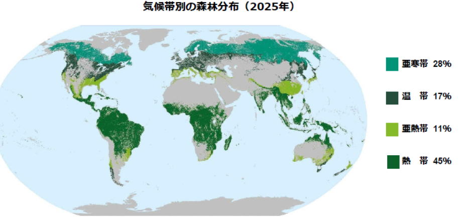 世界の森林面積は41億4000万ha。陸地面積の約3分の1(32%)を占め、気候帯別に見ると、熱帯に分布する割合が最も多く(45%)、以降、亜寒帯、温帯、亜熱帯が順に続く。(前KFとほぼ同じ) |