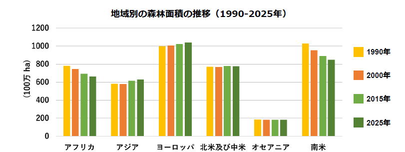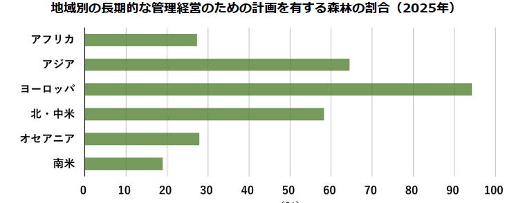 1990年以降、管理経営のための計画の対象となる森林面積は全地域で増加しており、世界全体では3億6500万ha増加し、2025年には21億3000万ha(森林総面積の55%)に達した。