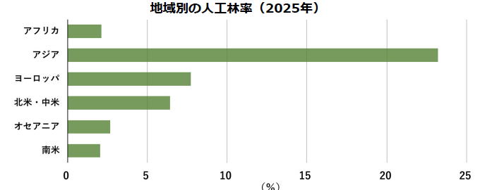 2025年の人工林面積(LANTED-FOREST AREA)は3億1200万haに上り、世界の森林面積の8%。(地域別人工林率が左図=アジアが多い) |