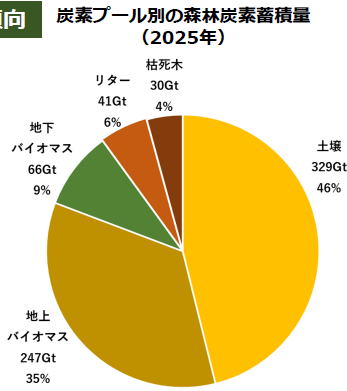 全ての炭素プールを含む森林炭素蓄積量は推定714ギガトン(平均172トン/ha)に上り、46%は土壌に、44%は地上・地下バイオマスに、10%はリター・枯死木に存在する(左図)。