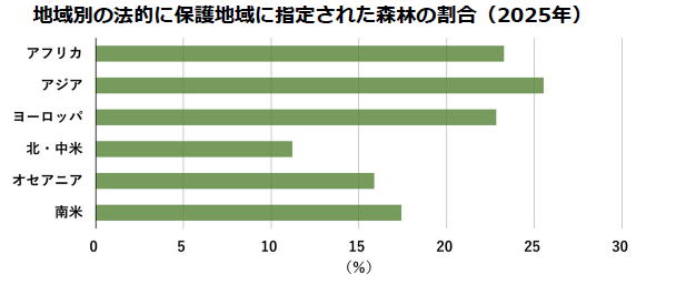 推定8億1300万haの森林が保護地域に指定されている。これは森林総面積の約20%。地域別にみると、アジアが最も高い(26%左図)。
