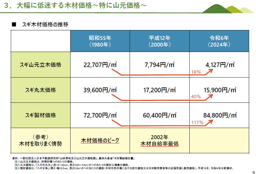 プレゼン最初の一枚が標記タイトルの右の図です 国土の森林率y「66%は、OECD加盟国(先進国)でフィンランド・スウェーデンについて第三位 人工林の蓄積は、世界中で中国・米国・ロシアについで第4位(右上) 森林蓄積は55年の約六倍、毎年6千万m3増加中(左下) 人工林の林齢面積は50年を超える人工林ガン現在6割で、そのまま行けば10年後には8割に(右下) 【ということで、日本の森林ガバナンスがうまくいけば世界中の森林ガバナンスの手本になります!!】(「とは書いてありません」勉強部屋コメント(以下【】かっこガキの部分は同じです。長官の言説ではありません) 日本の森林ガバナンスの課題を示す左の図です 1980年と2024年の木材の価格を比べると・・ スギの山元立木価格は18%、丸太価格は40%、製材価格は117% 市場が規定する川下の価格は少し増えているけど、【川上の森林関係者がさぼっていたので】原料価格は大幅な減少。 【森林関係者は補助金をもらうことに知恵を絞り、業務の効率化に知恵を絞らなかったツケがまわっているので】、今後の課題です ーーー