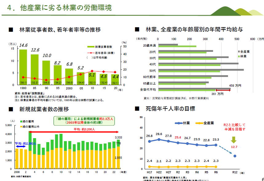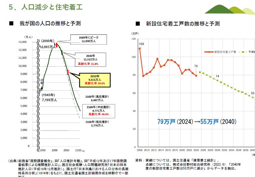 林業には、若年労働者が少ない 緑の雇用制度で、すこし新規就労者は増えたけども(右図左上) 給与が安い(右上)、労働災害も多い(右下) 【後述するように、労働災害の話は、川下のサプライチェーンへの訴求で、持続可能な森林管理の指標となっています ここに記載されていることは大切な林野庁の課題認識ですね】 現状と課題の最後のページが左の図、 日本の人口はどんどん下がり(左図左)、新築宅着工戸数は少しさがっていく(左図右) 【イントロTの最後にこの図があることは、「木材利用の拡大に取組むことの大切が次世代に森林ガナンスにとって、重要」という認識の表明ですね。】 【森林政策の課題を林野庁長官が語るイントロに「世界の潮流」として、気候変動・生物多様性の動きが記載されているのは素晴らしいですね】