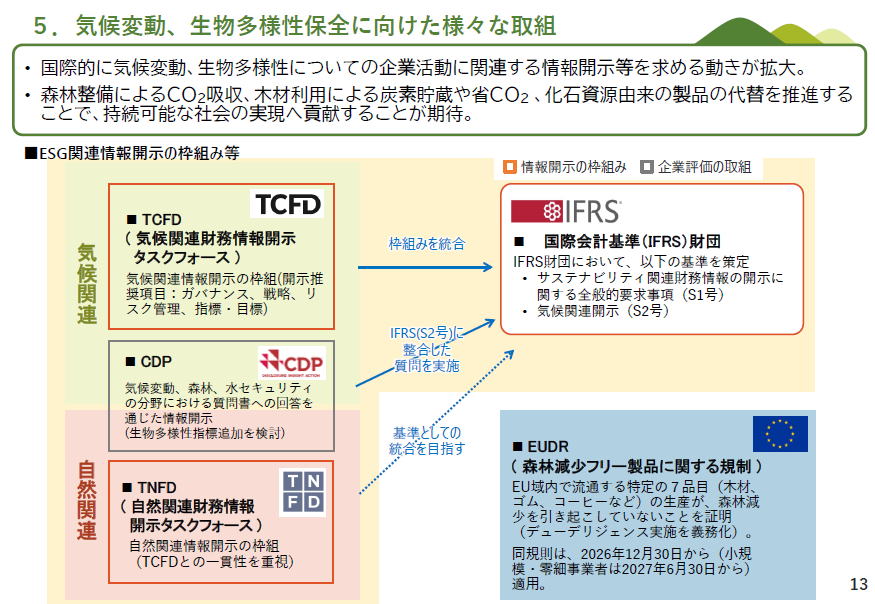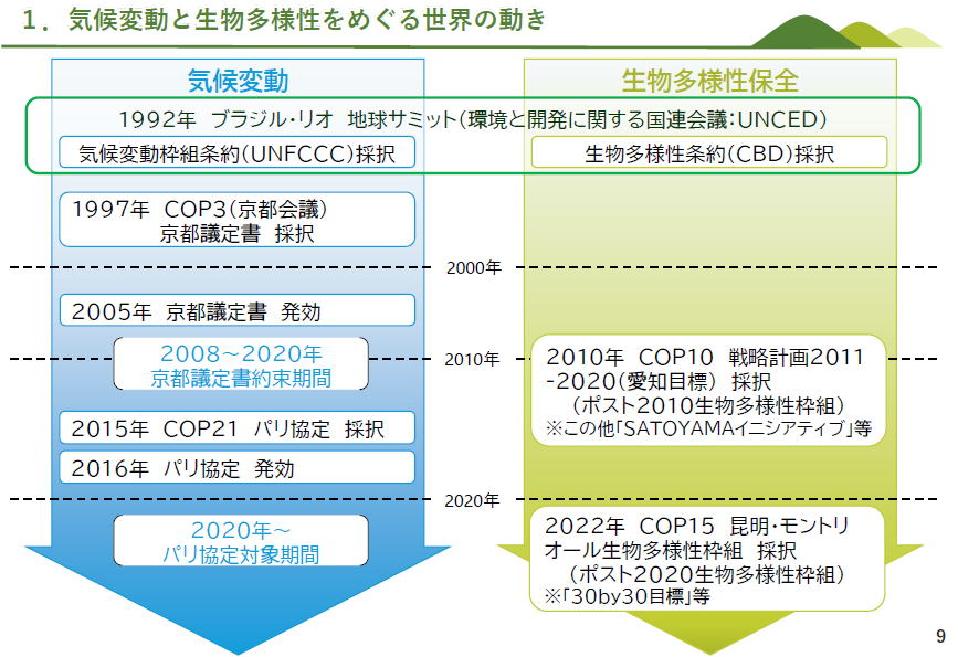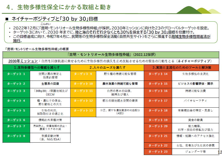 左の図です あまり新しいことは記載されてませんが、 以下のような説明が記載されています ・ネイチャーポジティブと「30 by 30」目標 1)2022年12月に「昆明・モントリオール生物多様性枠組」が採択。2030年ミッションに向けた23のグローバルターゲットを設定。
