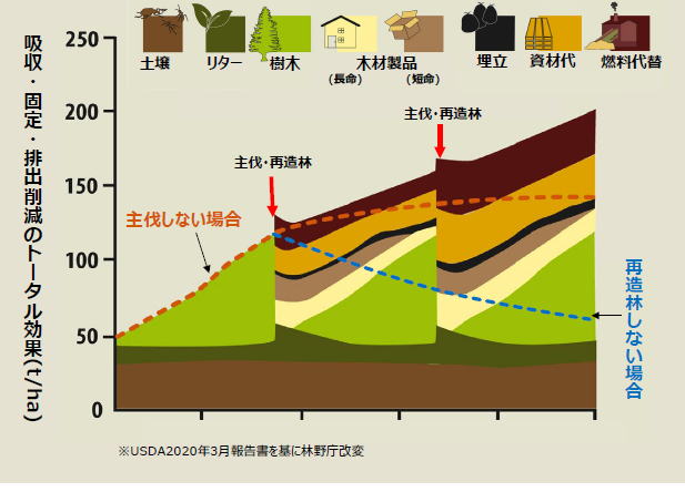 左の図、【少し難しいですが・・・、】 「森林資源の循環利用のサイクルが持続的に行われることにより、1)森林生態系における炭素蓄積に加え、2)伐採された木材製品を利用することによる炭素固定、3)石油由来製品やエネルギー消費型建築資材の代替資材、4)バイオマスエネルギー利用による化石燃料代替等の効果が発揮され、総体としての炭素の吸収・貯蔵量は増加し続ける一方、主伐後の再造林が行われなければ、炭素蓄積の増加を生み出す循環が途切れる」といった、、林野庁が時々使う図面です