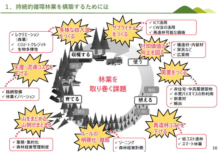 演題は:サステイナブルな「森の国・木の街」の実現を目指して 森林・林業基本計画を作り直す今年の冒頭に、森林行政の責任者から、持続可能な循環林業を構築するためにーという講演を聞く機会!!! プレゼンデータ(公開可能なデータのみに一部変更)を頂いたので、どうぞご覧ください→サステナブルな「森の国・木の街」の実現を目指してプレゼンデータ このページでは全部をできるだけ紹介しようと、下の目次のように少し長い説明ページになっています。 是非、時間をかかけて見ていただきたいですが、時間のない方は目次の ーーー 目次は以下の通りです