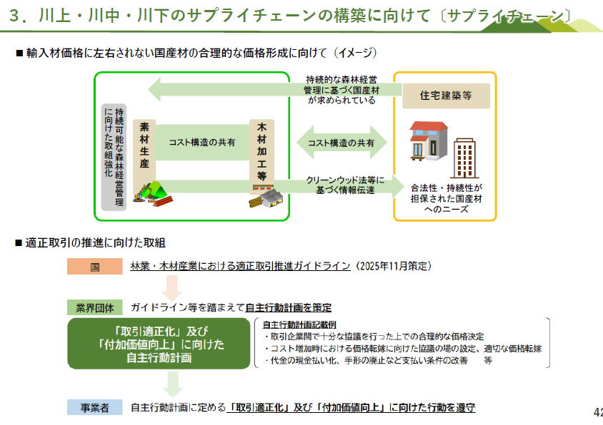 企業の協力をえて儲かる林業など、いろんな事例が示されていますがlここでは省略します。 興味のある方は、プレゼン資料P24からP34まで見てください 自給率50%を支える、大規模工場など。 製材・合板工場の大規模化・効率化による生産性向上や、非住宅向け部材の供給強化等の取組に加えて、工場間の水平連携により供給力を供給する取組も進展しているので、そのさぽーとが大切です (左の図 ) 輸入材価格に左右されない国産材の合理的な価格形成に向けて、持続的な森林経営管理に基づく国産材が求められています 川上と川下のコスト構造の共有やクリーンウッド法等に基づく情報伝達が必要です(右の図)