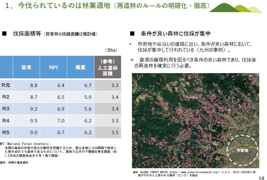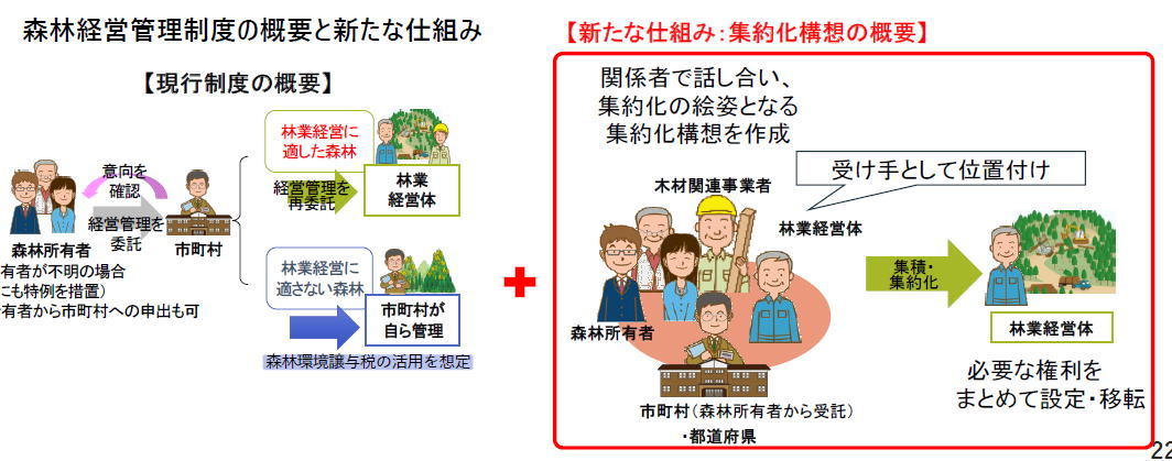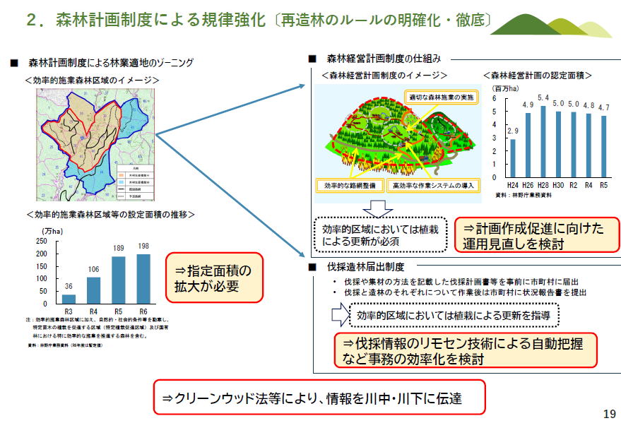 タイトルは:.気候変動、生物多様性保全に向けた様々な取組 以下のような説明が記載されています ・国際的に気候変動、生物多様性についての企業活動に関連する情報開示等を求める動きが拡大。 ということで、企業の環境情報開示の動きが、森林・林業基本計画作成の重要な基盤となりますよ 現行基本計画の内容ですが、森林・林業基本計画のアウトプットのサンプルです 山の上のほうの人里から離れた森林は、天然林に・・・現在55%なのを47%」に いろいろなところにある育成単層林は里山近くに限定して、現在41%なのを26%に そしてその中間を育成複層林として4%を27%にすることにしてます(現行計画) ーーー 以上がイントロとしての説明でした さていよいよ、本体のV森林・木材の持続的循環利用に向けて〜持続的循環林業を構築するためには〜 各論に入る前に「持続可能な林業を構築するためには」という一枚の図があります 右上の伐採するところから、使う、植える、育てる、収穫する、と輪和が回りているのはよくある図ですが・・・ 右上に 【そのすべてを紹介していきますが、特に、しっかりした森林管理が需要者との連携で進められる!!という議論を中心に説明していきます】 ーーー 左は重要なポイントの説明図 そのうちの左は、伐採面積(青の列)と植林面積(黒の列)にの比較 伐採面積のうち植林されているのは半分以下 伐採跡地に全部植えるのでない計画になっています。 前述したように、現行基本計画では、1050万haの育成単層林が次世代には660万haとなっているので、いまのままでそんな問題はないのでない?・・・でもそれは大間違え つまり、右側に記載されているように・・・ 条件が良い森林に伐採が集中しています 谷沿いの道路に近い、木材生産にとって条件が良い森林において、伐採が集中して行われているので、⇒これらの伐採跡地は資源の循環利用を図るべき条件の良い森林であり、伐採後の再造林を確実に行う必要があります 【それが半分しか植林されていない!?大問題です】 「効率的施業森林区域」というのを設定(左上の赤っぽい部分)、そのために右上にあるように森林計画制度を変更します そして、・伐採や集材の方法を記載した伐採計画書等を事前に市町村に届出 効率的区域においては植栽による更新を指導 という形にするんですね そして、最後の行に記載したるように ⇒クリーンウッド法等により、情報を川中・川下に伝達 ということで、クリーンウッド法にもとづいた木材は、伐採跡地の再造林ができている、持続可能な木材です! すごいですね、楽しみです。次の 現状では小規模所有者が多く、誰かに委託したいという人が3分の2 だから、関係者があつまって、林業事業体か一括してまとめて管理するような集約化構想を作成します。 左の図