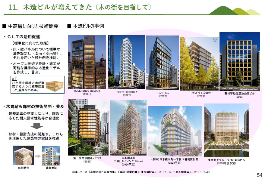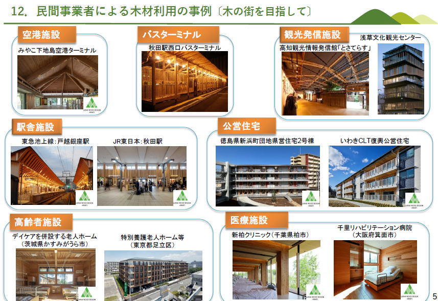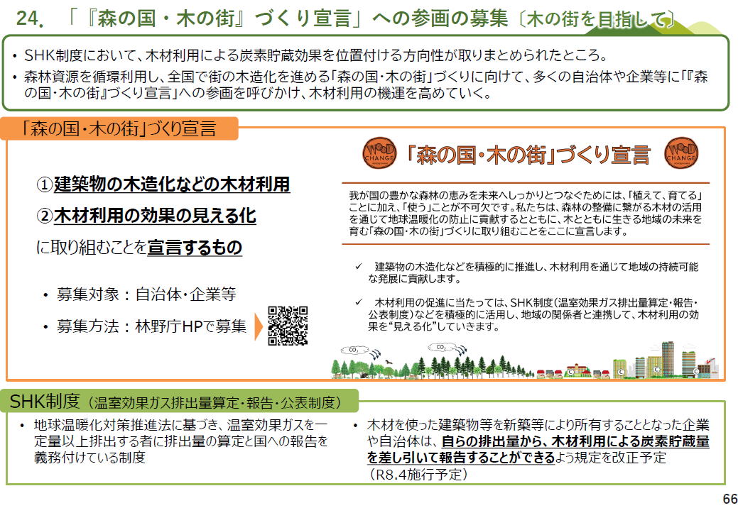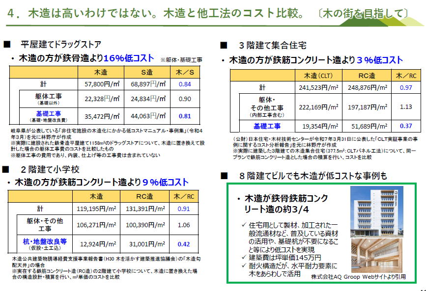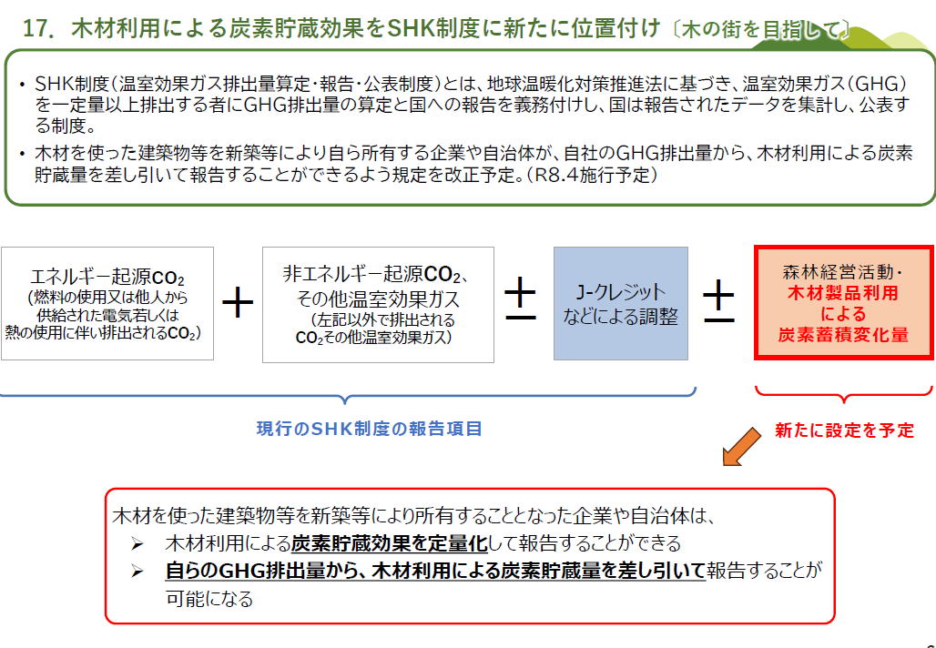 左の図にあるように、木造と、RC造やS造を比較した場合、平屋建てドラッグストア、2階建て小学校、3階建て集合住宅、どの場合も、木造の方が安い結果が出ています(左の図 右の図 そし、ウッドチェンジ協議会など官民挙げたネットワークが情報提供しています ーーーー ーーー 民間企業は、自社の環境貢献の情報開示に、木造施設を建設を取り上げる事例が増えています ーーー ライフサイクルアセスメントによって、鉄筋コンクリートで建てた場合と木造にした場合の炭素排出量の削減(左図左)と、 炭素の貯蔵量(左図右) 算出してネット上に表示 地球温暖化対策推進法に基づき、温室効果ガス(GHG)を一定量以上排出する者にGHG排出量の算定と国への報告を義務付けし、国は報告されたデータを集計し、公表する制度する、SHK制度(温室効果ガス排出量算定・報告・公表制度)。 その制度改正が予定されており、?木材を使った建築物等を新築等により自ら所有する企業や自治体が、自社のGHG排出量から、木材利用による炭素貯蔵量を差し引いて報告することができるよう規定を改正予定。(R8.4施行予定)