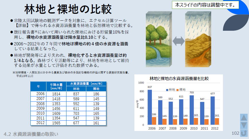 林地における水源涵養機能は、地質、降雨量、気温、林分の状況(密度、胸高直径 (水資源涵養量)=(降水量)ー(直接流出量)ー(蒸発散量) 【直接流出量】 森林総研が水文観測を行ってきたデータを元に、地質区分及び年間降水量データを用いて、企業等の取組により森林が保全・維持され続ける場合の森林から河川への直接流出量を推計。 【蒸発散量】 気象データ(気温、降水量)及び林分データ(針広区分、平均樹高、平均胸高直径、立木密 ーーー 少し詳しい説明が、【解説資料】林地における水資源涵養量(貯留機能)の簡易評価手法というデータに掲載されています。そこにこのデータをつかった事例が掲載されています 4.2 水資源涵養量の取扱い 左の図のように、 「2006〜2012年の7年間で林地は裸地の約4倍の水資源を涵養している結果となった。 といった森林の水機能な大切さを訴求ができるようですね (森づくり活動??) ただし、日本では裸地に植林をして森づくりをするという例は、少ないので、自分の森林に例えば間伐したらどうなると?ということには、使えないかな・・ ーーー おって、林野庁のサイトに詳しいデータが掲載される予定だそうです。 大切な情報なので加筆してまいります。 kokunai8-8<mizukinoubiz> |