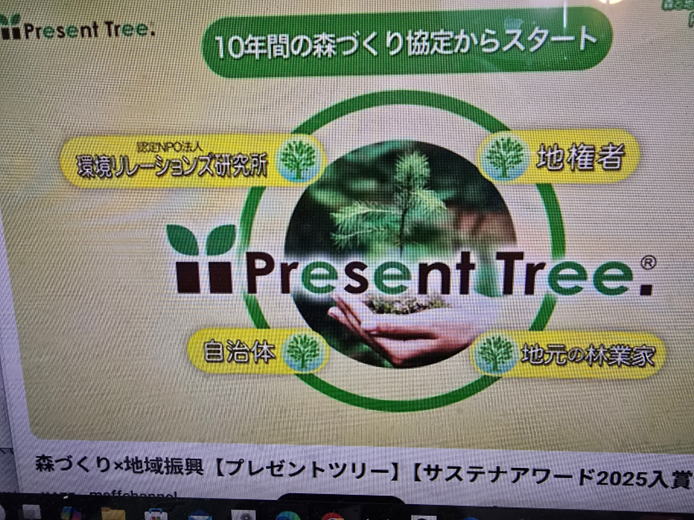 (=「あふの環(わ)2030プロジェクト〜食と農林水産業のサステナビリティを考える〜」は、2030年のSDGs達成を目指し、今だけでなく次の世代も豊かに暮らせる未来を創るべく立ち上げられたプロジェクト) そのプロジェクトの一環として行われている、食や農林水産業に関わるサステナブルな取組動画を表彰する「サステナアワード2025」の受賞策が公表されました。 その中の、脱炭素賞に、 認定NPO法人環境リレーションズ研究所が作成した動画「 森づくり×地域振興【プレゼントツリー】」が受賞しました。 (勉強部屋が応援してきたプレゼントツリー) というプレゼントツリーの取組については、主催者であるNPOの理事長が、NPOが森林脱炭素チャレンジに応募するにあたっての活動結果の森林のCO2吸収量を算出過程で林業経済研究所(藤原も関わりました)が林野庁の委託事業で開発した二酸化炭素の見える化吸収量についての使用方法について議論したけいいもあり、応援してきました 脱炭素勉強部屋もZOOMセミナーのゲストにお迎えて・・・プレゼントツリー:森林再生と地域振興の同時実現を目指して20年〜の今までとこれからー勉強部屋Zoomセミナー第1回報告(2025/6/10) 森林再生と地域振興にむけてPresentTreeー環境リレーションズ研究所の取組(2023/2/15) ーーーーーー