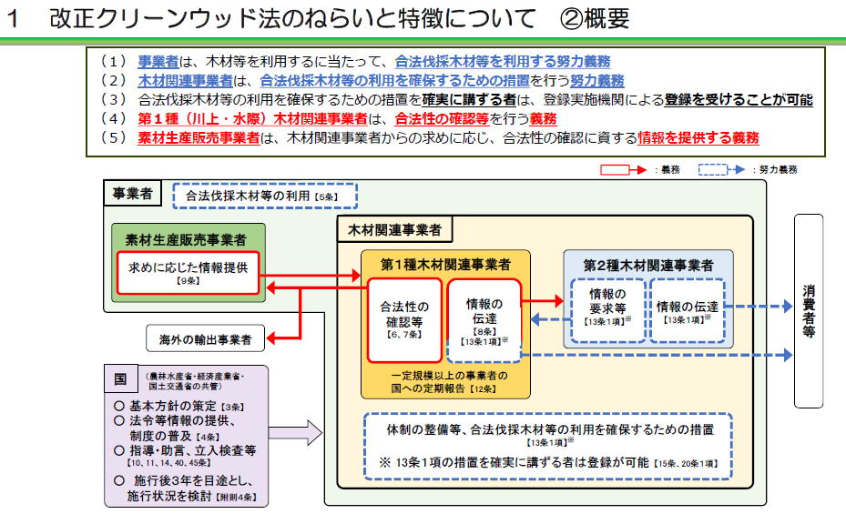 大きなポイントは、事業者が義務を負うことです。木材事業者は、合法木材を利用する努力義務とか素材生産事業者の情報提供義務など