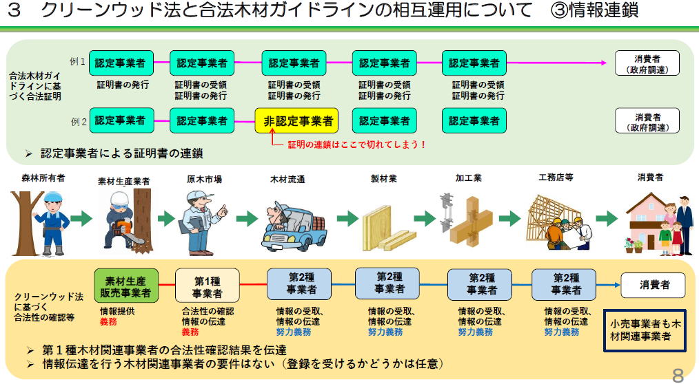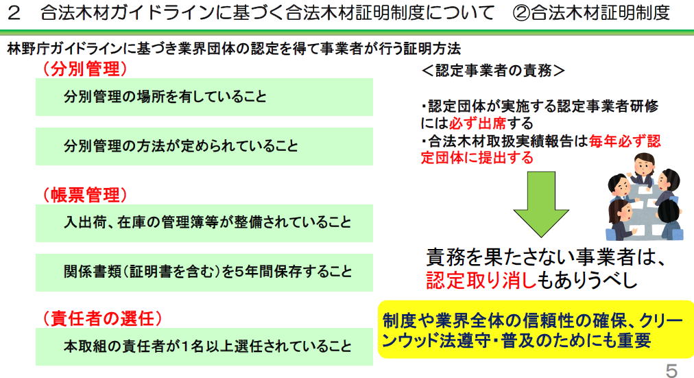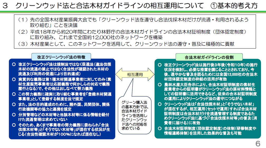 林野庁ガイドラインが指定する業界団体認定のシステムと、そのごクリーンウッド法で木材事業者へのハードルも数段高くなったので、その方向性は相互連携ですね