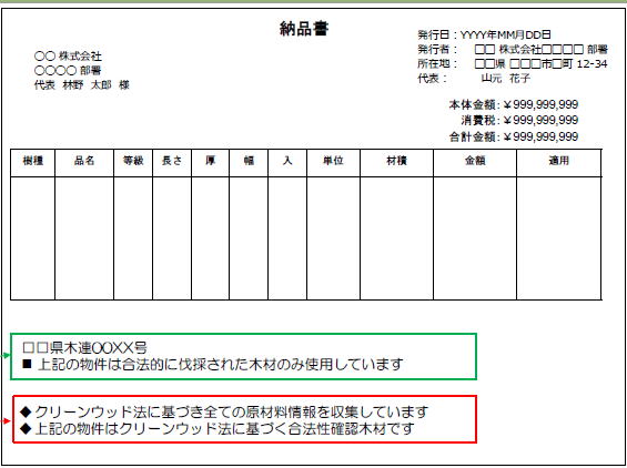 そのサンプルが、提示された、納品書のの納品書の例で .下の緑の□は、合法木材GLの団体認定の伝達事項、その上にCW法の伝達事項が赤い□です