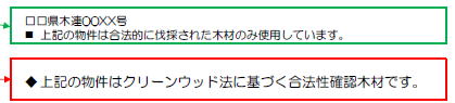合法木材ガイドライン(団体認定制度等)を活用してCW法に基づく合法性確認を行った場合も(この納品書にように)、当該制度に基づく伝達情報とは別に、CW法に基づく合法性確認結果を記載する必要があります。赤い□