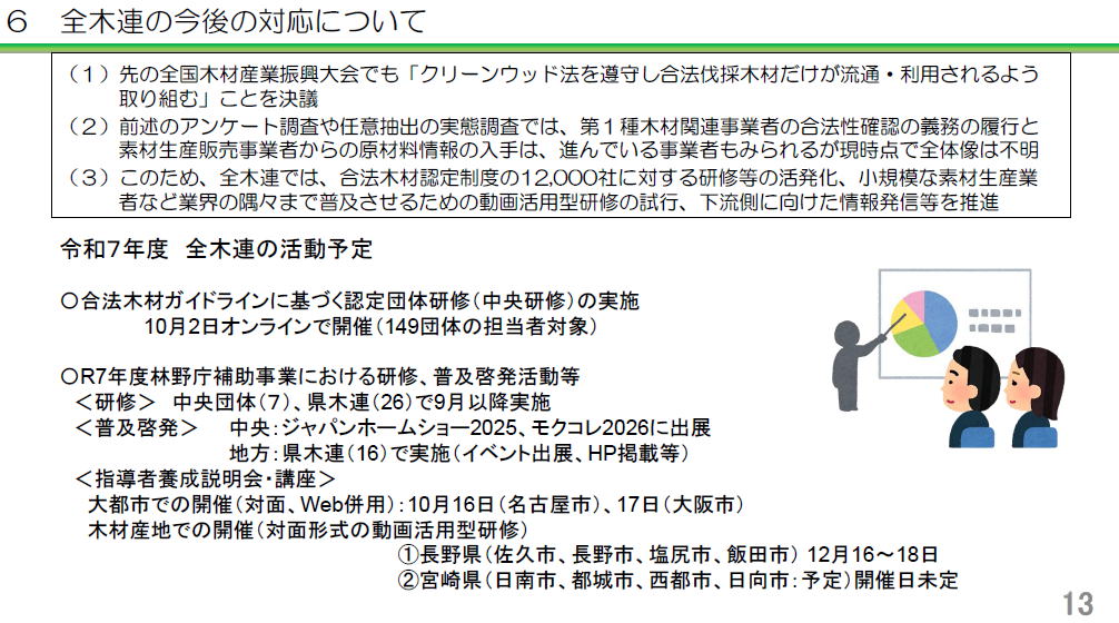 (3)このため、全木連では、合法木材認定制度の12,000社に対する研修等の活発化、小規模な素材生産業者など業界の隅々まで普及させるための動画活用型研修の試行、下流側に向けた情報発信等を推進