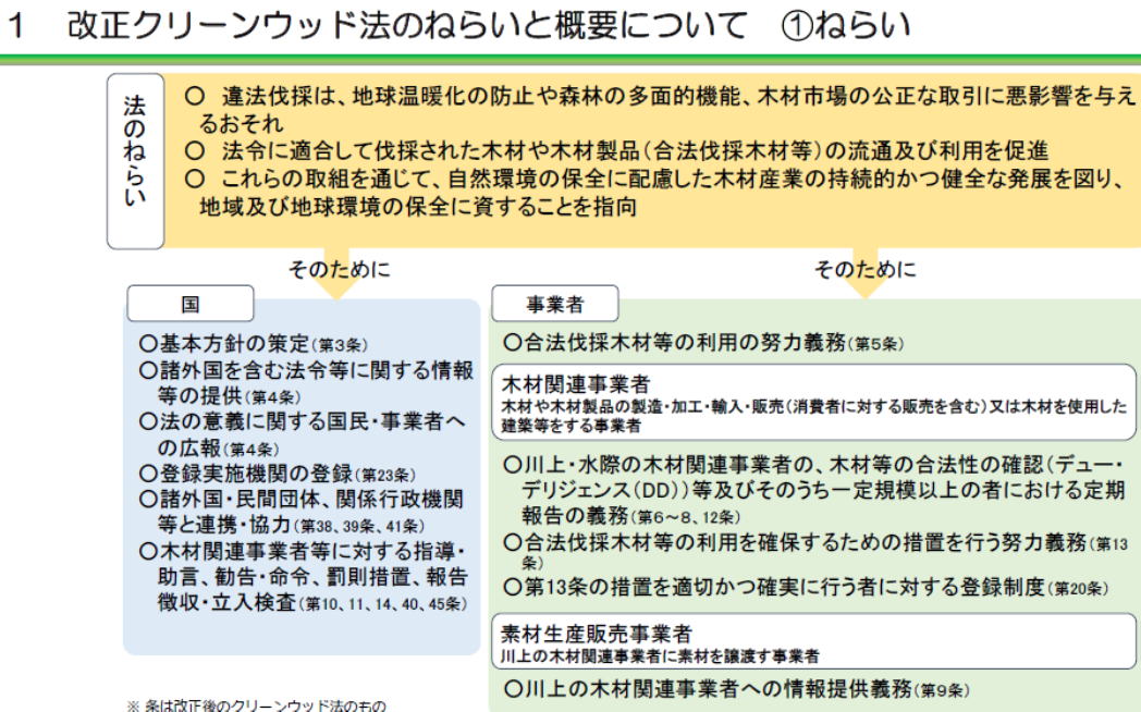 まず、イントロの1として、4月に施行された改正クリーンウッド法の、説明。