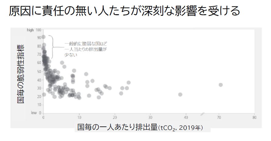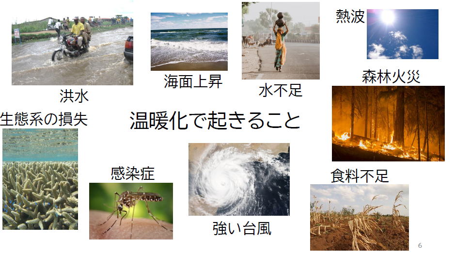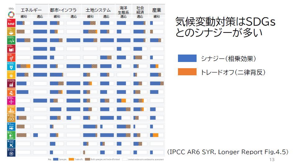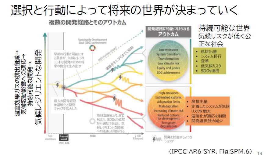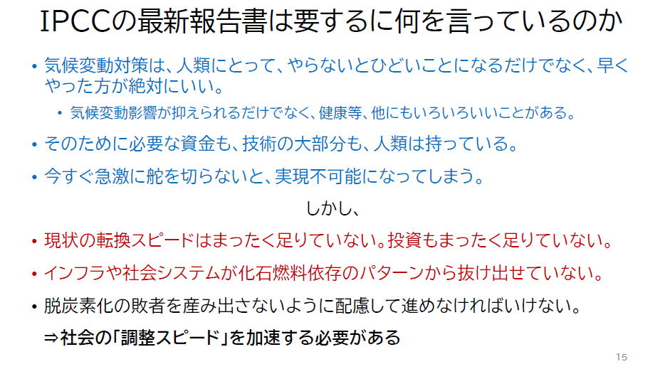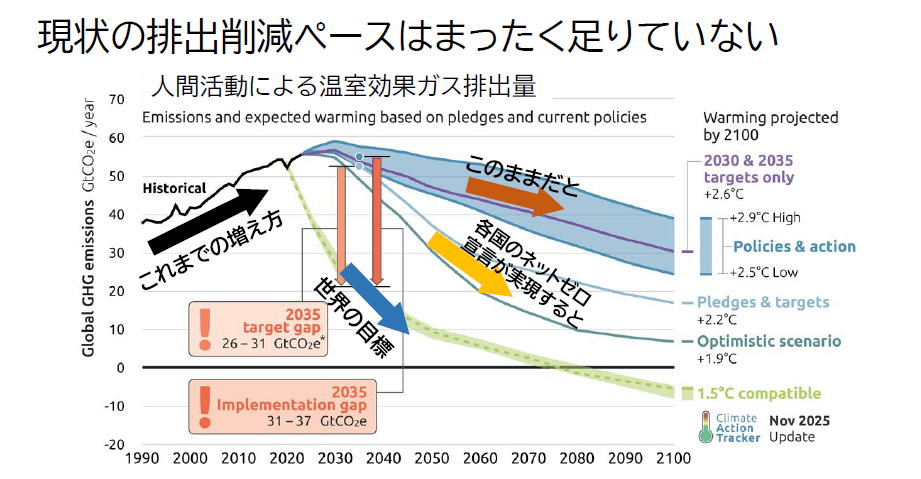 「もともと、気候変動のシミュレーションをやったいたのですが、温暖化ブームで科学解説、懐疑論論争などに対応し温暖化政策論争で環境派vs経済派を観察•しているうちに、科学の政治的「中立性」、政策判断の価値依存などに興味を持つ」ようになり、市民とのコミュニケーションに力をいれるようになりました。(本日の登壇もその一環です・・・とは書いてありませんー藤原加筆) 市民とのとのコミュニケーションの実績紹介・・・右上の図の右側に記載している、YouTube面白いです。↓こちらのリンクからご覧になれます 20分でわかる温暖化のホント ーーーー 講演タイトル:「地球温暖化と我々の未来ーブラジルアマゾンでのCOP30の結果を踏まえて森林関係者への期待」、いただいた公開可能なプレゼン資料にそってご紹介します。<すこし藤原が加筆:その部分はですます調です> プレゼンの順番は以下の通りです ((第一部 地球温暖化と我々の未来)) 記録的な高温が続く!! 今年の日本の夏は特に上振れ スライドのタイトルは「人間の影響による温暖化には「疑う余地が無い」 人間活動による温室効果ガス排出量はどんどん増えている(1850年から2019年まで)右の図の左、 産業革命前からの世界平均気温変化(右の図の右) 自然要因だけでシミュレーションすると、当該図の右下青い部分、実際の気温と外れる。人為要因と自然要因を合わせてシミュレーションすると、実際の気温とぴったり合う。だから、「疑う余地はない」(IPCC7第6次報告書)(今までの報告書は「高い確率で影響がある」など、初めて「疑う余地がない」になったそうです) 洪水、海面上昇、森林火災、水不足、熱波 生態系損失、感染症、強い台風 森林火災、食料不足・・・・タクサン ーーーーーーーーーーーーーー 温暖化が進むと影響が深刻化し、地域差は拡大します(右の図) 二つの事例 1 生物種の損失リスクが、熱帯地方で増える上の図 左が1,5度C上昇、次に2度C上昇、右が4度C上昇の比較 2 高温高湿による人間の死亡リスクの差 死に至る熱中症を引き起こしうる日平均気温・湿度条件になる年間日数、が熱帯地域でどんどん増える 排出量が「非常に高い」シナリオ(対策無し) 排出量が「低い」シナリオ(~2℃安定化) 横軸は国毎の一人あたり排出量(tCO2, 2019年) 縦軸は、国ごとの漸弱性指数(12の紛争リスク指数に基づいてFFPという団体が公表) 一人当たりのGHG排出量が少ない国が、深刻な影響ですね。 「世界的な平均気温上昇を産業革命以前に比べて2℃より十分低く保つとともに、1.5℃に抑える努力を追求する」 「今世紀後半に人為的な温室効果ガスの排出と吸収源による除去の均衡を達成する」 ということがきましました。が・・・ 縦軸が世界ぜ体のGHG排出量、横軸が時間(左が1990年、右が2100年) 青い→が、1.5度に向けたGHG排出量 肌色の→が、各国のネットゼロ宣言(2050年までにGHGゼロ)2度 赤の→が、」再エネ電源などがいまの、まま進行した場合 パリ協定を実現するには、大きな転換が必要です!!!が・・・ 左の縦列ががSDGsの17項目 一番上の行が気候変動対策のカテゴリーごとの、緩和と適応 相乗効果シナジーの青が二律背反の茶色より圧倒的に多い 未來にむけて実施する温暖化対策(子や孫のため)の手法は、今の私たちの幸せにもつながります。 シナジー(相乗効果) IPCC6次報告書の最後に記載されている図です 左の出発点が現在で、青い左の線が、今からしっかり取り組めば青い線にそって、気候リスクが低く、公正な社会で持続可能な社会になっていく、頑張りましょうねということをわかり易く示しています。 この表の大切なところは現在まだ、皆が頑張って社会システムを変更して青い線に乗っているわけではいません。50年までにカーボンニュウートラルだとか言っているので、黄色い線なのかもしれませんが、ある程度黄色い線にのると、もう青い線にもどることはできませんよーということを指摘している図でもあるのですね。 第1部地球温暖化と我々の未来(メインテーマ)のまとめ 気候変動対策は、人類にとって、やらないとひどいことになるだけでなく、早くやった方が絶対にいい。 そのために必要な資金も、技術の大部分も、人類は持っている。(風力発電、太陽光発で等エネルギ供給過程が例示されましたが・・・勿論熱帯地域の荒廃した森林劣化をとめる技術も持っています) 今すぐ急激に舵を切らないと、実現不可能になってしまう。 しかし、現状の転換スピードはまったく足りていない。投資もまったく足りていない。(3倍から6倍スピードアップさせないと・・)• 脱炭素化の敗者を産み出さないように配慮して進めなければいけない。(」以下のシステムで儲かっている人もいるけど、配慮して・・・) ⇒社会の「調整スピード」を加速する必要がある(皆さん一緒に相談していきましょう)
