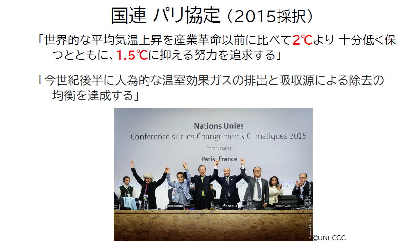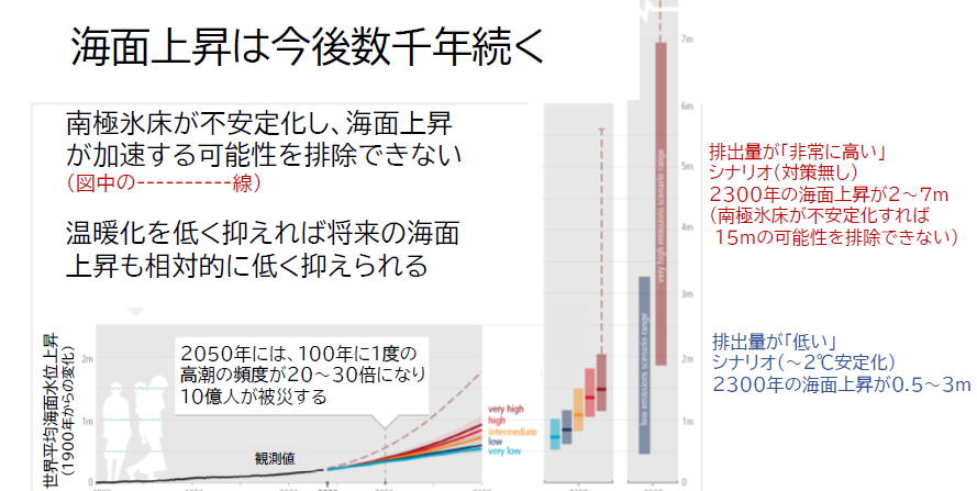 真ん中の線の (江守さんのコメント1) 上の排出量が最近少し平らになっている(排出量合計が増加が止まっている)のは土地の排出量が少なくなってい来たから・・(全体の枠組み評価に森林が影響を与えるか統制があるので頑張ってというメッセージだと思います(藤原加筆)) (江守さんのコメント2) 最近測定【推定)方法が変化したので、海中の吸収量が増加した形になっている。昔は土地が排出量の3割を吸収していると言われていたが、最近は2割