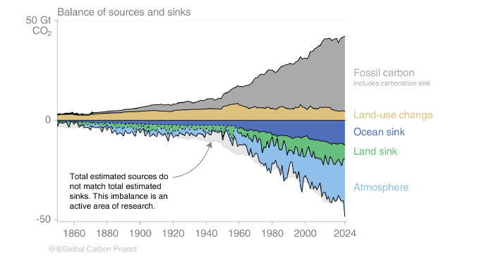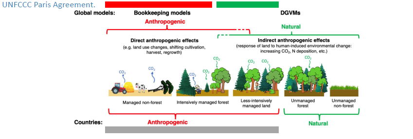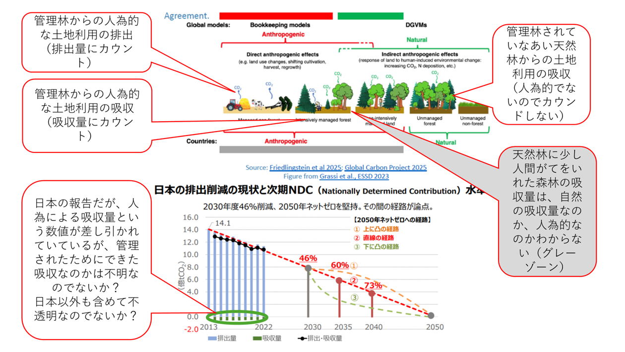 タイトルはMapping of global carbon cycle model land flux definitions to the definition of the LULUCF net flux used in national Greenhouse Gas Inventories (NGHGI) reported to UNFCCC 和訳すると:地球炭素循環モデルの陸域フラックス定義と、UNFCCCに報告された国別温室効果ガスインベントリ(NGHGI)で使用されているLULUCFネットフラックス定義とのマッピング 本分を和訳すると:管理林における自然フラックス(2014~2023年で年間-6.9 GtCO2)を土地利用由来排出量(年間5.0 GtCO2)に加えると、GCB2025の推定値(年間-1.9 GtCO2)は各国報告データ(年間-3.8 GtCO2)に近づき、陸域CO2フラックスの人為的炭素予算推定値をUNFCCCパリ協定に基づくグローバル・ストックテイクに直接結び付けます。(ごめんなさいわかりづらいです) 以下この図に関する江守さんのコメントです