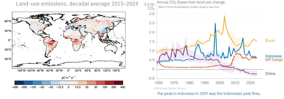 左半分にあるようにブラジル、コンゴ、インドネシアなどが排出地域(赤い点)、中国は植林が進んでいるので、青(吸収量が多い) 右半分で国別の推移を表示。中国が近年植林が増えているということがわかるが、中国の植林は単一樹種の拡散ということで、ネガティブに見る見解も広がっている