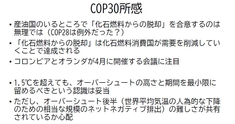 右の図COP30の結果 •「化石燃料からの脱却」の言及無し(二年前にグローバルストックテイクで全体の成果が評価され、それにもとづく、、行動計画作成などが検討されてきましたが、結果が公表されるところまでいきませんでした) 1.5℃目標の堅持したのはよいところ(ですが実質的にはオーバーシュート前提) 2035年までに適応資金3倍増への努力(大きな議題だったけれど、30年までといううのが35年までに努力)となりました。) 熱帯林保護基金TFFF設立!!! いままでは、熱帯林問題の対応は先進国が途上国を支援するという(REDD+)等のシステムだったが、ブラジル等が主導して、途上国が自分でも拠出する、そして民間資金も参画という新しいシステムが出発したので、」評価する人が多い、重要なプロジェクトです) 「気候変動に関する情報誠実性宣言」というのが合意されたのは大切な成果です(日本は不参加) 米国代表団の不在(来て邪魔するより良かったという人もあり)(米国は国の主導する資金拠出は絶対しない) COP30の所感(江守さんの個人的コメント2点)右の図 <1>化石燃料からの脱却の新たな道を探ろう <2>すごく困難な道を歩もうしていることを覚悟して ((第3部ー森林関係者への期待)) COP30の期間中にGlobal carbon budgetという報告書が公表され、森林関係者には大切な情報もあるので、以下お伝え
