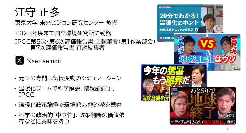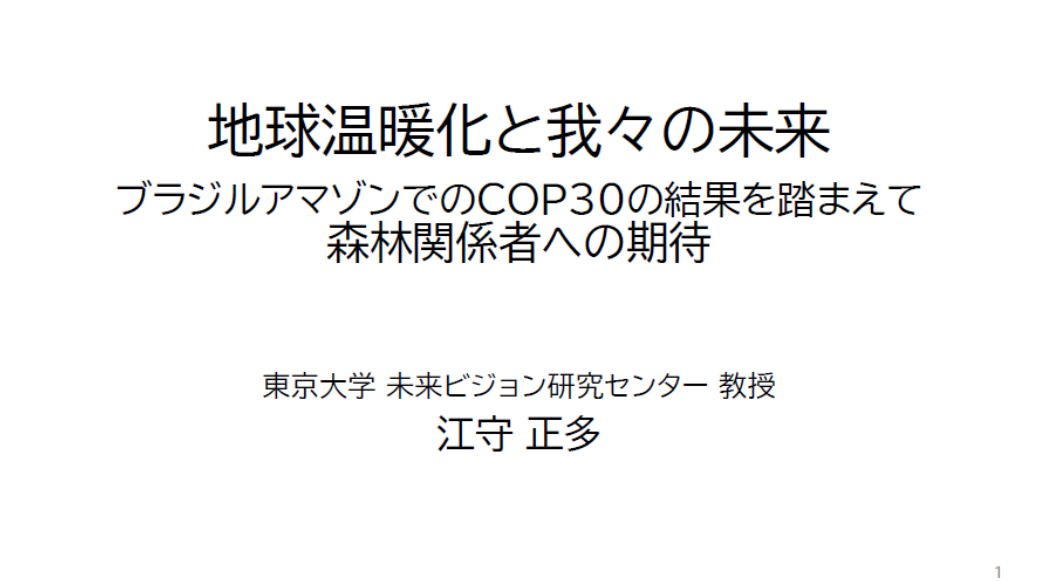 ゲストに江守正多二さん(東京大学未来ビジョン研究センター教授)を迎え「地球温暖化と我々の未来ーブラジルアマゾンでのCOP30の結果を踏まえて森林関係者への期待」というテーマに沿って、お話を伺い意見交換をさせていただきした。 ーーー 江守正多さんは御案内のように、気候変動に関する政府間パネル(IPCC)報告書の主執筆者の一人をつとめる気候変動問題の第一人者で、気候科学研究者です。