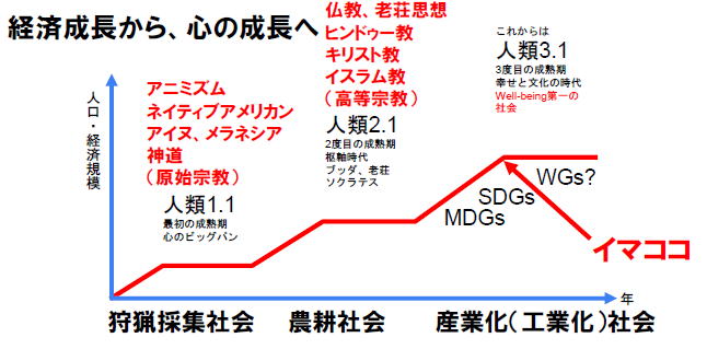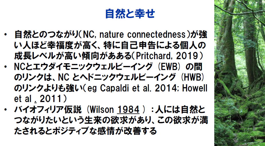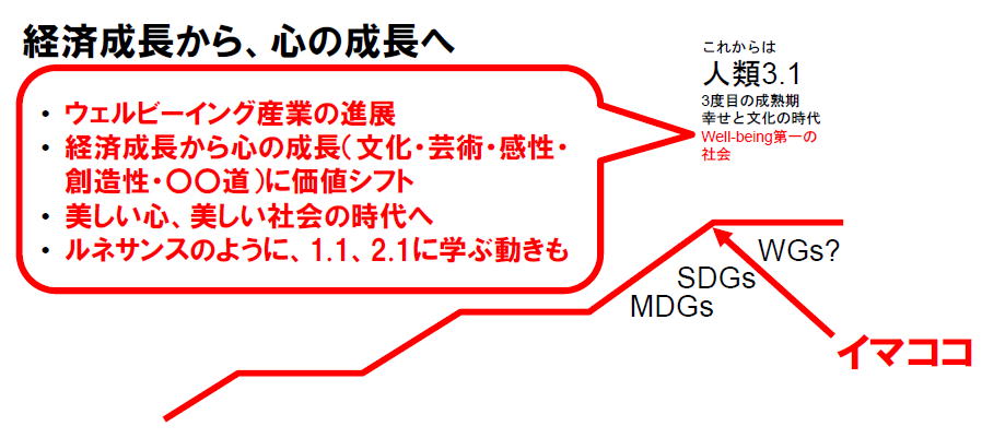 (フォーラムの開催趣旨) SDGs・VUCA(Volatility(変動性)/Uncertainty(不確実性)/Complexity(複雑性)/Ambiguity(曖昧性))の時代を迎え、企業でも自律型で共創型の組織づくり・人づくりが目指されています。会議室での企業研修では変革に向かいにくいという課題から、森林を活用した企業研修やオフサイトミーティングを導入する事例が増えています。本フォーラムでは、企業による豊かな森林空間を活用した体験プログラム(森のプログラム)の活用事例や、森林サービス産業推進地域が提供するプログラムの紹介、地域と企業の交流会を開催します。ーーーとされています(チラシから)。 右の図のとおり、企業が森の中で人づくりを進める事例が、企業の側から中堅層向け、経営層向けなど、たっぷり紹介されていて、それの舞台を提供する山側からの森林サービス産業推進地域のPR活動なども紹介があり、企業の人事担当の参加者が面白そうだから、山側の人とマッチングするという、という筋書きのわかり易い、イベントでした 詳しいプレゼン内容がネット上に公開されているので、関心の有る方は、是非ご覧ください 勉強部屋では、今回のような企業と森をつなぐコンセプトの背景を紹介された、基調報告1「SDGs・VUCAの時代における自然を活かしたウェルビーイングな組織づくり・人づくり:武蔵野大学ウェルビーイング学部長、慶應義塾大学名誉教授 前野 隆司 氏」の内容をご報告します ((「SDGs・VUCAの時代における自然を活かしたウェルビーイングな組織づくり・人づくり)) イントロにあるのが、左の図です。 本当に幸せな状態はHappinessdでなくWellbeingなんですよー 「健康」と「幸せ」と「福祉」のすべてを包む概念として捉え、なかでも「幸せ」という要素を中心に考え、ウェルビーイングをを使っているのだそうです 右の図は、縦軸が地球上の人口で一番下が1万人、真ん中が1000万人、一番上が100億人そして 横軸が現在からの点数で1番左が100万年前、次が10万年前、次が1万年前、千年前、100年前、一番右が10年前です 3つのカーブがあります。 基資料は、「グレタさん」は現代の「イエスかブッダ」なのか(広井良典)東京経済オンライン2020.1.27、 先程の図を人類史と重ね合わせると、一番左が20万年前に人類誕生から始まる狩猟採取社会、次が1万年前の農耕開始から始まる農耕社会、その次一番右が、3−4百年前から始まる産業化(工業化)社会の三つに整理できます。 どの時代も最初は右上がりになり、あるポイントでそれがとまって、定常化時代を迎えるという図式です。(面白い!) そして、現在現在が3回目の変曲点(イマココ)。基資料は「人口減少社会』広井良典(京都大学こころの未来研究センター教授)だそうです。 ネット上に詳しい関連資料が掲載されているので、紹介します→広井良典:「グレタさん」は現代の「イエスかブッダ」なのか 三つの時代を2つに書けると6つの時代になりますね。 人類1.0_最初お成長期 と説明があります ウェルビーイング産業の進展 という説明がありました そして、最後に人類史に中で、今の時点で大切なのが、自然との関係性ですという説明が(右図の通り)以下の通りありますー この表は、根拠となる学術論文が紹介されています ーーー 自然とのつながり(NC, nature connectedness)が強い人ほど幸福度が高く、特に自己申告による個人の成長レベルが高い傾向がある(Pritchard, 2019) ーーーー すみません。原著論文にうまくいきつかない点もありましたが、ネット上でみつけた参考資料を掲載しています。(この部分は勉強部屋の責任です)