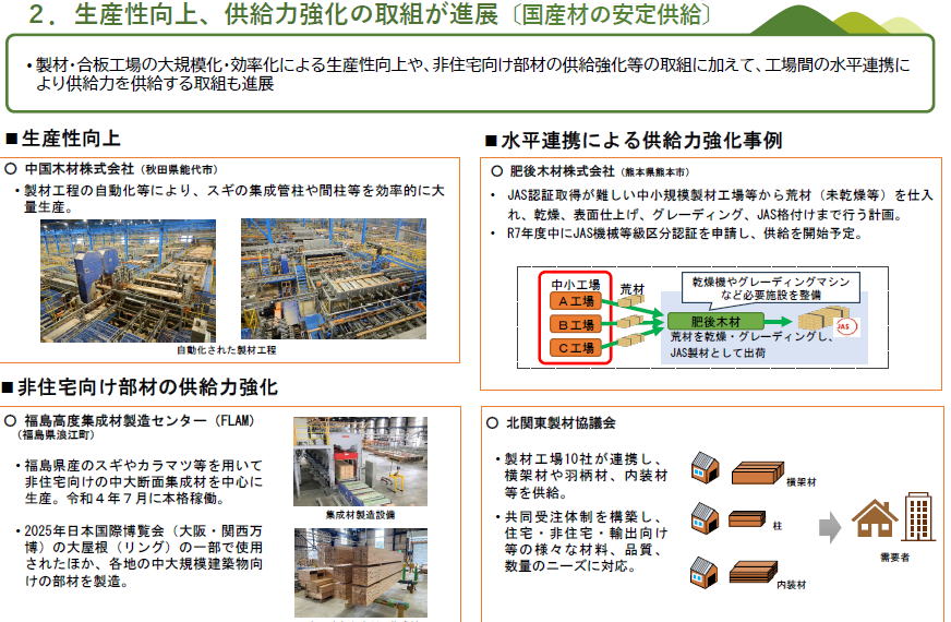企業の協力をえて儲かる林業など、いろんな事例が示されていますがlここでは省略します。 興味のある方は、プレゼン資料P24からP34まで見てください 自給率50%を支える、大規模工場など。 製材・合板工場の大規模化・効率化による生産性向上や、非住宅向け部材の供給強化等の取組に加えて、工場間の水平連携により供給力を供給する取組も進展しているので、そのさぽーとが大切です (左の図 ) 輸入材価格に左右されない国産材の合理的な価格形成に向けて、持続的な森林経営管理に基づく国産材が求められています 川上と川下のコスト構造の共有やクリーンウッド法等に基づく情報伝達が必要です(右の図)