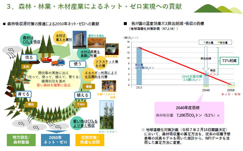 地球温暖化対策計画(2025)の中にも、しっかり吸収量がカウンドされています。(右の図右)