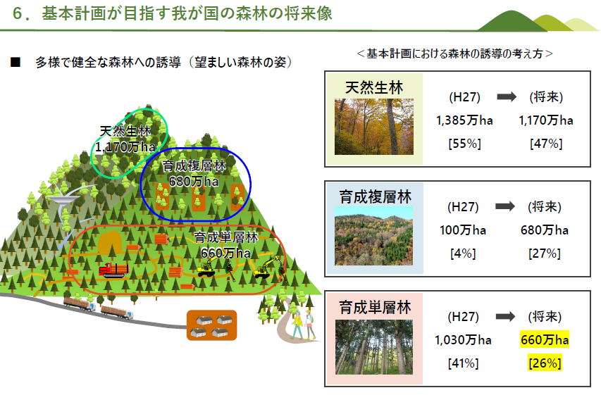 演題は:サステイナブルな「森の国・木の街」の実現を目指して 森林・林業基本計画を作り直す今年の冒頭に、森林行政の責任者から、持続可能な循環林業を構築するためにーという講演を聞く機会!!! プレゼンデータ(公開可能なデータのみに一部変更)を頂いたので、どうぞご覧ください→サステナブルな「森の国・木の街」の実現を目指してプレゼンデータ このページでは全部をできるだけ紹介しようと、下の目次のように少し長い説明ページになっています。 是非、時間をかかけて見ていただきたいですが、時間のない方は目次の ーーー 目次は以下の通りです