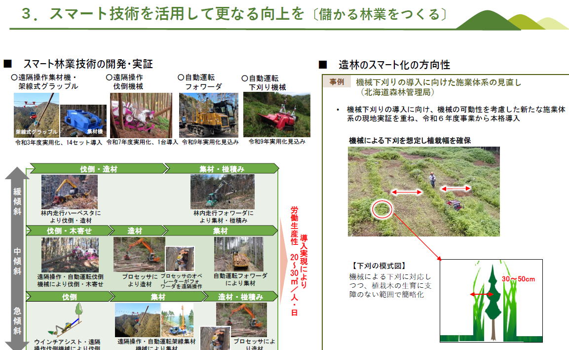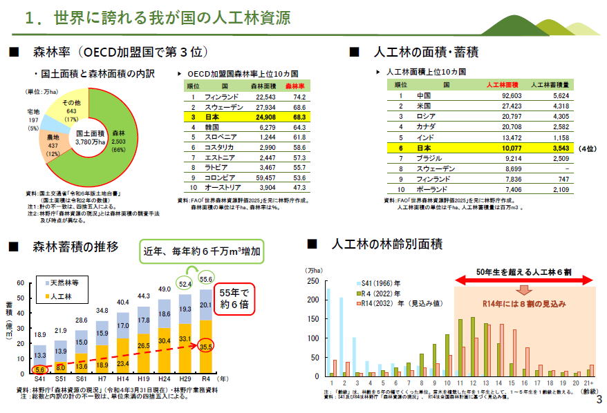 プレゼン最初の一枚が標記タイトルの右の図です 国土の森林率y「66%は、OECD加盟国(先進国)でフィンランド・スウェーデンについて第三位 人工林の蓄積は、世界中で中国・米国・ロシアについで第4位(右上) 森林蓄積は55年の約六倍、毎年6千万m3増加中(左下) 人工林の林齢面積は50年を超える人工林ガン現在6割で、そのまま行けば10年後には8割に(右下) 【ということで、日本の森林ガバナンスがうまくいけば世界中の森林ガバナンスの手本になります!!】(「とは書いてありません」勉強部屋コメント(以下【】かっこガキの部分は同じです。長官の言説ではありません) 日本の森林ガバナンスの課題を示す左の図です 1980年と2024年の木材の価格を比べると・・ スギの山元立木価格は18%、丸太価格は40%、製材価格は117% 市場が規定する川下の価格は少し増えているけど、【川上の森林関係者がさぼっていたので】原料価格は大幅な減少。 【森林関係者は補助金をもらうことに知恵を絞り、業務の効率化に知恵を絞らなかったツケがまわっているので】、今後の課題です ーーー