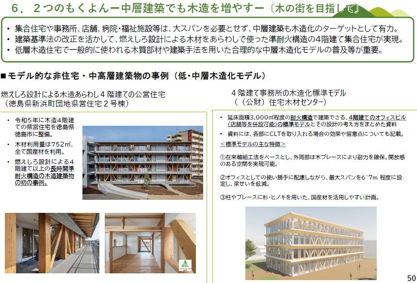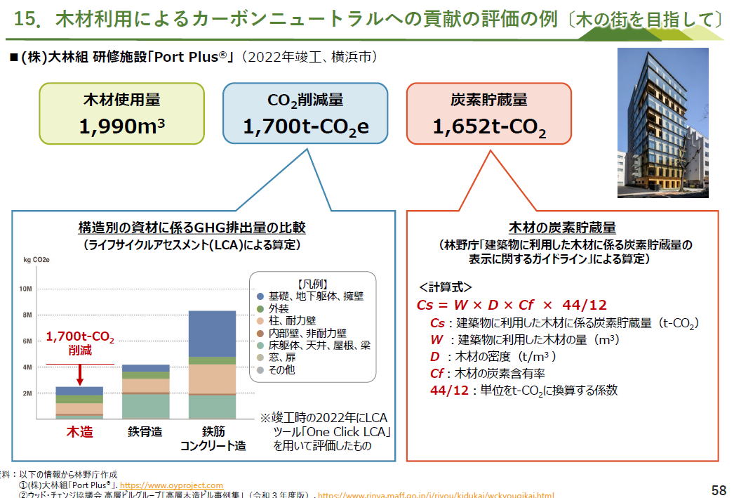 左の図にあるように、木造と、RC造やS造を比較した場合、平屋建てドラッグストア、2階建て小学校、3階建て集合住宅、どの場合も、木造の方が安い結果が出ています(左の図 右の図 そし、ウッドチェンジ協議会など官民挙げたネットワークが情報提供しています ーーーー ーーー 民間企業は、自社の環境貢献の情報開示に、木造施設を建設を取り上げる事例が増えています ーーー ライフサイクルアセスメントによって、鉄筋コンクリートで建てた場合と木造にした場合の炭素排出量の削減(左図左)と、 炭素の貯蔵量(左図右) 算出してネット上に表示 地球温暖化対策推進法に基づき、温室効果ガス(GHG)を一定量以上排出する者にGHG排出量の算定と国への報告を義務付けし、国は報告されたデータを集計し、公表する制度する、SHK制度(温室効果ガス排出量算定・報告・公表制度)。 その制度改正が予定されており、?木材を使った建築物等を新築等により自ら所有する企業や自治体が、自社のGHG排出量から、木材利用による炭素貯蔵量を差し引いて報告することができるよう規定を改正予定。(R8.4施行予定)