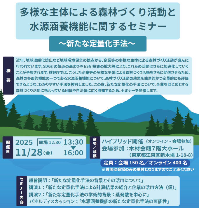 | 多様な主体による森林づくり活動と水源涵養機能〜新たな定量化手法〜(2025/12/1) |