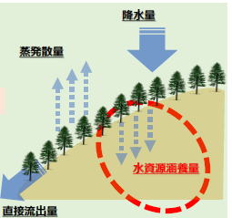 林地における水源涵養機能は、地質、降雨量、気温、林分の状況(密度、胸高直径 (水資源涵養量)=(降水量)ー(直接流出量)ー(蒸発散量) 【直接流出量】 森林総研が水文観測を行ってきたデータを元に、地質区分及び年間降水量データを用いて、企業等の取組により森林が保全・維持され続ける場合の森林から河川への直接流出量を推計。 【蒸発散量】 気象データ(気温、降水量)及び林分データ(針広区分、平均樹高、平均胸高直径、立木密 ーーー 少し詳しい説明が、【解説資料】林地における水資源涵養量(貯留機能)の簡易評価手法というデータに掲載されています。そこにこのデータをつかった事例が掲載されています 4.2 水資源涵養量の取扱い 左の図のように、 「2006〜2012年の7年間で林地は裸地の約4倍の水資源を涵養している結果となった。 といった森林の水機能な大切さを訴求ができるようですね (森づくり活動??) ただし、日本では裸地に植林をして森づくりをするという例は、少ないので、自分の森林に例えば間伐したらどうなると?ということには、使えないかな・・ ーーー おって、林野庁のサイトに詳しいデータが掲載される予定だそうです。 大切な情報なので加筆してまいります。 kokunai8-8<mizukinoubiz> |