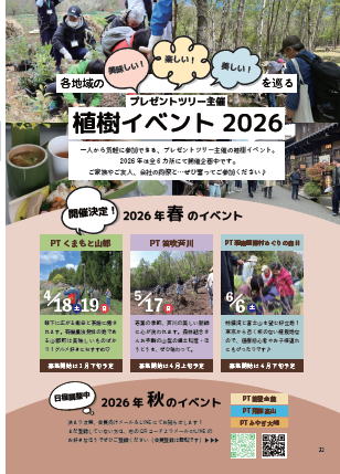 ーーーー 左の図 植樹イベント2026ー 一人から気軽に参加できる、プレゼントツリー主催の植樹イベント。 kokunai4-69<pretree2> |