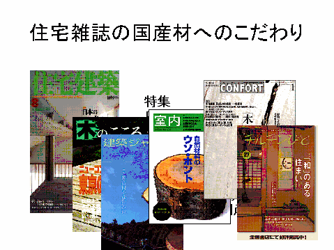 ウッドマイルズ研究会の取材などで住宅雑誌の関係者と話をする機会が結構ありますが、住宅雑誌の国産材特集が増えています。